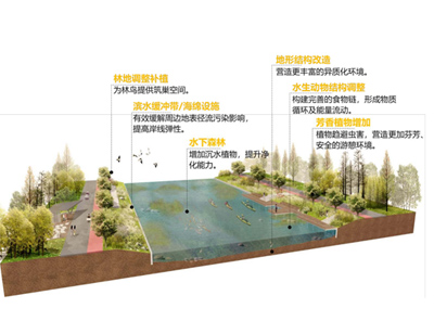 从林、田、居的角度,全 域实施基于自然的解决方案,打 造共融共生的空间风貌,提升小 流域生境的层次性、丰富性及和 谐性。